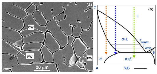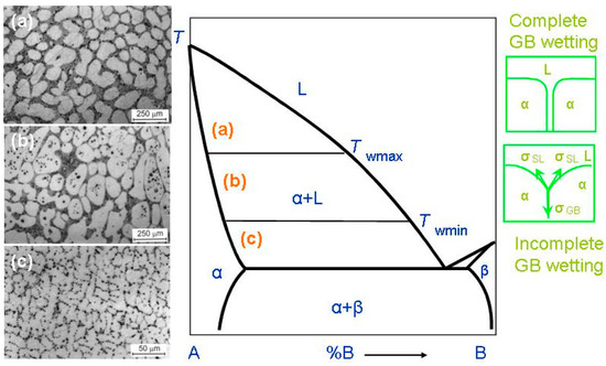 Such microstructures of two-phase polycrystals can be seen in Figure 2 (micrographs in the left-hand side). These are the microstructures of the binary Al–Mg alloys. As a result, a conventional phase diagram for 3D-phases gets the additional tie-lines at Twmin and Twmax for 2D GB wetting transformations. At T > Twmax all GBs in a polycrystal are fully wetted and contain, therefore, the melted layer between solid grains. The micrograph (a) on the left-hand side of the phase diagram shows an example of how the microstructure of the two-phase α + L polycrystal of the Al–Mg alloy can appear above Twmax. The micrograph (a) is reprinted with permission from ref. [60]. In this sample, all (Al)/(Al) GBs are completely wetted by the Mg-rich melt. The liquid phase surrounded all solid (Al) grains. The Twmax tie-line describes the GB wetting transformation for GBs with the lowest σGB in a polycrystal. By cooling, the first partially wetted GBs appear below Twmax. Between Twmax and Twmin, the amount of completely wetted GBs decreases with decreasing T. The micrograph (b) on the left-hand side of the phase diagram shows an example of how the microstructure of the two-phase α + L polycrystal of the Al–Mg alloy can appear between Twmin and Twmax. The micrograph (b) is reprinted with permission from ref. [60]. In this sample, some (Al)/(Al) GBs are completely wetted by the Mg-rich melt and other (Al)/(Al) GBs are partially wetted by the liquid phase. At Twmin, the completely wetted GBs disappear. The Twmin tie-line describes the GBs with the highest energy σGB. Below Twmin there are no completely wetted GBs in an alloy, and the polycrystal has only partially wetted GB with θ > 0. The respective example of the Al–Mg alloy is shown in the micrograph (c) on the left-hand side of the phase diagram.