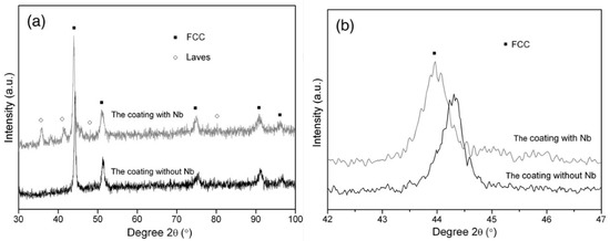 (a) XRD patterns of the CoCrCuFeNi and CoCrCuFeNiNb coatings; and (b) the detailed scans for the peak of (100) of fcc phase. Reprinted with permission from ref. [84]. Copyright 2014 Elsevier.