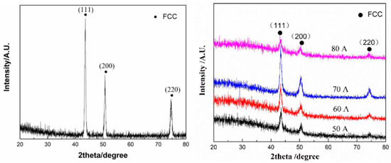 XRD patterns of CoCrFeNiMn HEA powder (left) and plasma cladded CoCrFeNiMn HEA coatings (right) deposited at plasma arc currents of 50, 60, 70, and 80 A. Reprinted with permission from ref. [13]. Copyright 2021 MDPI.