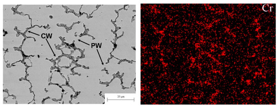 (left) SEM micrograph of the plasma cladded CoCrFeNiMn HEA coating. Arrows with the symbol CW show the completely wetted GBs. Arrows with the symbol PW show the partially wetted GBs. (right) EDS map of chromium in the middle part of the CoCrFeNiMn coatings prepared at plasma arc current of 70 A. Micrographs are reprinted with permission from ref. [13]. Copyright 2021 MDPI.
