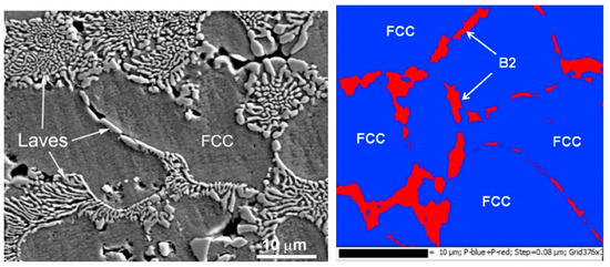 The phase which wets the fcc/fcc GBs in HEAs cannot exclusively be Laves phase. Thus, in the work of Wang et al. [94], the Co25Cr25Cu12.5Ni25Al12.5 (at.%) HEAs were produced by the spark plasma sintering. The XRD pattern contains the fcc peaks as well as the peaks of the B2 phase. The electron backscattering diffraction (EBSD) combined with the SEM images shows that the minor B2 phase is positioned in the fcc/fcc GBs (Figure 8, right). Moreover, the layers of the B2 phase are not continuous. They do not fully separate the grains of the fcc solid solution in the matrix. This case corresponds to the incomplete GB wetting by the last portions of the melt during solidification. In other words, the green dotted line in the scheme in Figure 3b perfectly describes the situation in the Co25Cr25Cu12.5Ni25Al12.5 (at.%) HEAs [94]. This means that the Twmax and Twmin temperatures are indeed higher than the temperature of eutectic transformation as it is shown in the scheme in Figure 3b.