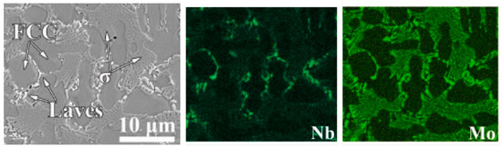 In some cases, the plasma cladded HEA coatings contain more than one phase wetting the GBs. A good example is the Co26.57Ni26.81Cr17.71Mo7.63Nb2.40B12.67Si6.22 (at.%) HEAs deposited by a plasma cladding PW3L machine at a gun speed of 300 mm/s and a feeding rate of 15 g/min [95]. The XRD patterns contain the peaks of the fcc major phase and two minor phases, namely the Laves phase and σ-phase. The SEM micrographs and EDS mapping (Figure 9) shows that the fcc grains are completely surrounded by the layers of Laves phase and σ-phase. The Laves phase is enriched by molybdenum and Co-depleted. The σ-phase is enriched by niobium and Cr-depleted.