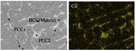 The matrix phase in the plasma-cladded HEA coatings is not always the fcc one. It can also have the base-centered cubic (bcc) lattice, such as, for example, in the Fe19.49Co19.49Ni19.49Al19.49Cu19.49Si2.55 (at.%) HEA coating [96]. It was deposited by the A PAW-160 plasma cladding machine. The XRD pattern revealed that this HEA coating contained three solid solution phases, one with bcc and two with fcc lattice. Figure 10 (left) shows the SEM micrograph of this plasma-cladded Fe19.49Co19.49Ni19.49Al19.49Cu19.49Si2.55 (at.%) HEA coating [96]. Almost all bcc matrix grains are surrounded by the GB layers of fcc1 and fcc2 phases. They are copper-enriched (Figure 10, right). Some of the GB layers of fcc1 and fcc2 phases are interrupted. These bcc/bcc GBs were incompletely wetted by the melt at the last stage of solidification.
