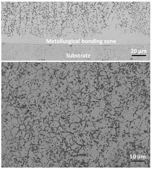 In the work of Cheng et al. [42], the CoCrCuFeNi equimolar HEA coatings were deposited with plasma cladding on the Q235 steel substrate. The coatings also contained the different amounts of TiC and TiB2-reinforcing particles. The matrix was formed by fcc phase. The fcc/fcc GB wetting layers contained, after solidification, the bcc phase (dark grey phase between light grey matrix grains in Figure 13). The TiC and TiB2 reinforcing particles are faceted and appear almost black in Figure 13. Similar to the micrographs in Figure 12, the fusion zone close to the substrate dose not contain any wetted fcc/fcc GBs. They first appear at a distance about 20 μm from the substrate.