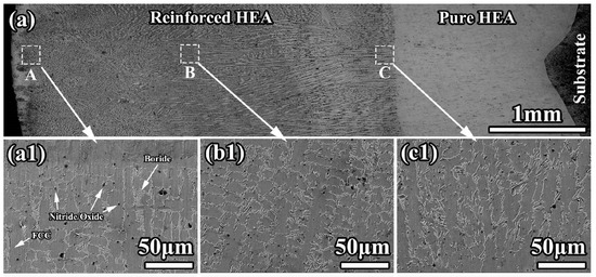 (a) Light micrograph for the cross-section of composite coating; (a1,b1,c1) are the SEM micrographs showing the morphology in the A, B, and C areas in (a). Reprinted with permission from ref. [106]. Copyright 2022 Elsevier.