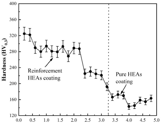 Microhardness distribution of reinforced HEA coating. Reprinted with permission from ref. [106]. Copyright 2022 Elsevier.