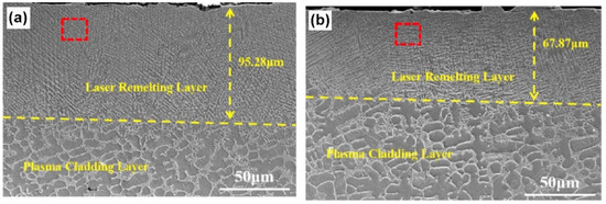 XRD patterns of the PC coating contained only the phase with bcc lattice, whereas the LRM7 and LRM8 coatings consisted of the mixture of two phases with bcc and fcc lattices. In Figure 16, it is visible that in the plasma cladding layer (lower parts of the micrographs), the grains of the bcc phase were completely or incompletely surrounded by the solidified portions of the melt, as in Figure 3. The laser remelting completely changes the microstructure, the grain size decreases and the fcc grains are completely surrounded by the bcc layers.