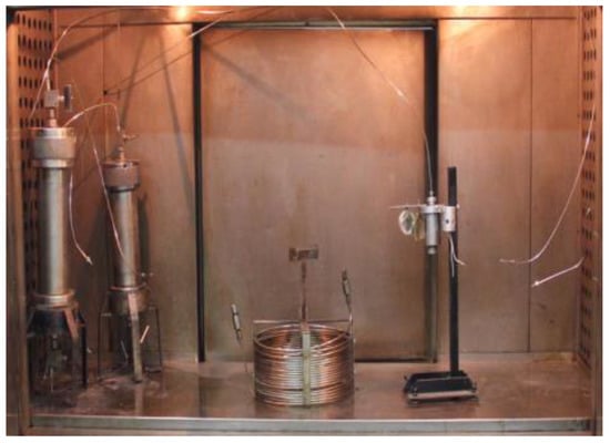 The experimental devices for phase equilibrium experiments with CO2-near-critical volatile oil and CO2-near-critical volatile oil-formation water, slim-tube experiment of miscible phase characteristics, and oil displacement efficiency for CO2 injection and CO2–water co-injection are shown in Figure 1 and Figure 2. The two-phase equilibrium experiment of CO2-near-critical volatile oil and the three-phase equilibrium experiment of CO2-near-critical volatile oil-formation water were experimented on using a high-temperature and high-pressure visualization mercury-free PVT device (Figure 1), which can be used to observe the phase changes in fluids in the PVT experiment cell by computer acquisition of images recorded by the camera. The experimental temperature range of PVT device is 0~200 °C, and the pressure range is 0.1~70 MPa. The device for the slim-tube experiment on the miscible characteristics and oil displacement efficiency for CO2 injection and CO2–water co-injection contains high-pressure displacement pump, slim-tube, back-pressure valve, observation window, gasometer, electronic balance, oil chromatograph, and gas chromatograph. The parameters of the slim-tube are shown in Table 2.