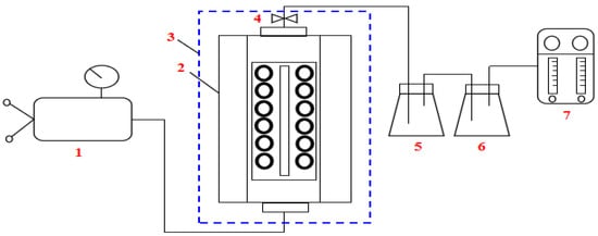Flow chart of PVT behavior phase experiment flow: 1. High-pressure displacement pump, 2. PVT cell, 3. Constant temperature air bath, 4. Valve, 5. Gas–liquid Separation bottle, 6. Gas indicator bottle, 7. Gasometer.