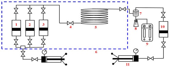 Flow chart of slim-tube experiment: 1. Intermediate container for CO2, 2. Intermediate container for water, 3. Intermediate container for oil, 4. Valve, 5. Slim tube, 6. Constant temperature air bath, 7. Back pressure valve, 8. Gas–liquid separator, 9. Gasometer, 10. Intermediate container for N2, 11. High-pressure displacement pump.