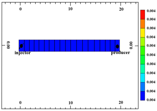 Using Builder module of CMG, pure CO2 injection and CO2–water co-injection in 1D slim-tube based on GEM component simulator for formation fluids were used to simulate the miscible characteristics of pure CO2 injection and CO2 –water co-injection on near-critical volatile oil. The dimensions of the slim-tube model were designed as follows: the length of the slim-tube is 20 m, the cross section is square, the side length is 0.0044 m, the average porosity is 9.43%, and the average permeability is 9.7 mD. The grid is divided into 50 in the X direction, one each in the Y and Z directions, and the grid steps are DX = 0.4 m, DY = 0.0044 m, and DZ = 0.0044 m. There is one well at the initial end and one at the end of the model. One well is a production well and the other is an injection well. The model is shown in Figure 5.