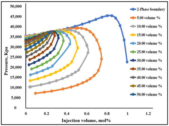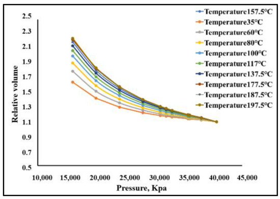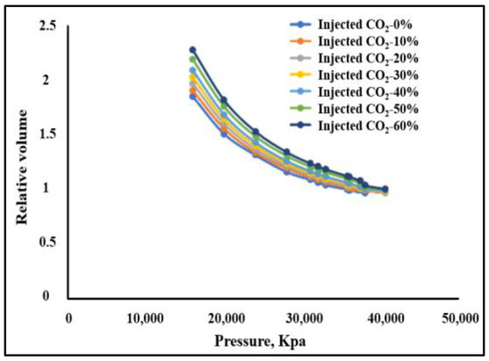 Relative volume versus pressure at different CO2 injection molar quantity.
