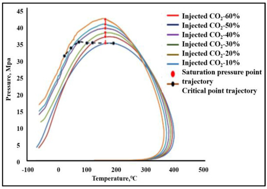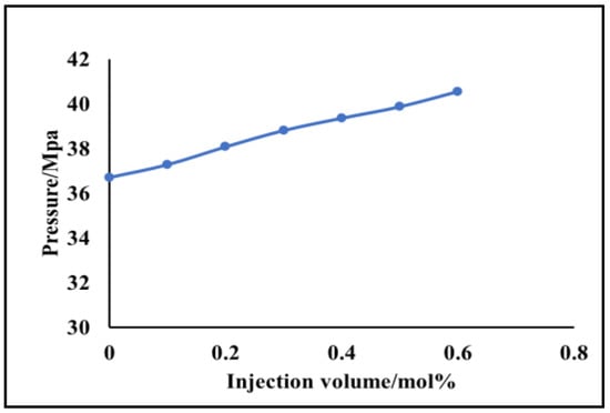 The experimental and simulation results of near-critical volatile oil injected CO2 phase characteristics are shown in Figure 8, Figure 9, Figure 10, Figure 11, Figure 12 and Figure 13. The experimental results of near-critical volatile oil injection CO2 phase characteristics (Figure 8, Figure 9 and Figure 10) show that the relative volume increases with the increase in injected CO2 content in the system, decreases with the increase in pressure, and gradually converges to 1. It shows that, under the high-pressure condition, more CO2 is dissolved in the near-critical volatile oil system to form a single phase, resulting in the relative volume gradually tends to 1, and eventually, CO2 will be completely dissolved in the near-critical volatile oil system to become the single-phase. The near-critical volatile oil saturation pressure gradually increases with the increasing amount of CO2 injection. After injecting 20 mol% of CO2, the saturation pressure was 37.37 MPa, and when the injection amount reached 60 mol%, the system saturation pressure reached 43.09 MPa. With the increasing injection of CO2, the density of near-critical volatile oil gradually increases, while the viscosity gradually decreases, indicating that the CO2 is in a supercritical state under the conditions of formation temperature and different saturation pressure. The higher density and lower viscosity of CO2 in supercritical conditions have better pumping ability, which eventually leads to the increase in density and decrease in viscosity of crude oil after CO2 injection. The phase characteristic simulation results for CO2 injection on near-critical volatile oil (Figure 11, Figure 12 and Figure 13) show that, under the formation conditions (temperature of 157.5 °C and pressure of 40.6 MPa), the saturation pressure of the system gradually increases with the increasing amount of CO2 injection, the critical temperature gradually decreases, the critical pressure initially increases and then decreases, and the critical point moves to the upper left. When the injection amount reaches 10~20%, the heavy hydrocarbon components in the system are extracted, which makes the phase characteristics transform from a near-critical volatile oil system to a condensate gas system. When the CO2 injection amount reaches 20 mol% under the original formation conditions, the gas and crude oil reach the primary contact miscible phase, and the primary contact miscible pressure is 37.62 MPa. With the increasing pressure, the gas–liquid two components keep approaching, and when the injection pressure reaches 36.25 MPa, CO2 and the original formation fluid reach the miscible-phase state through multiple contacts, namely, the multiple-contact miscible pressure is 36.25 MPa.