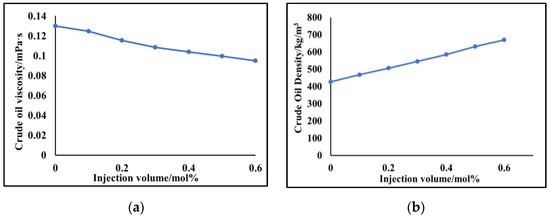 Variation of crude oil viscosity and crude oil density under different CO2 injection molar quantity: (a) oil viscosity and (b) oil density.