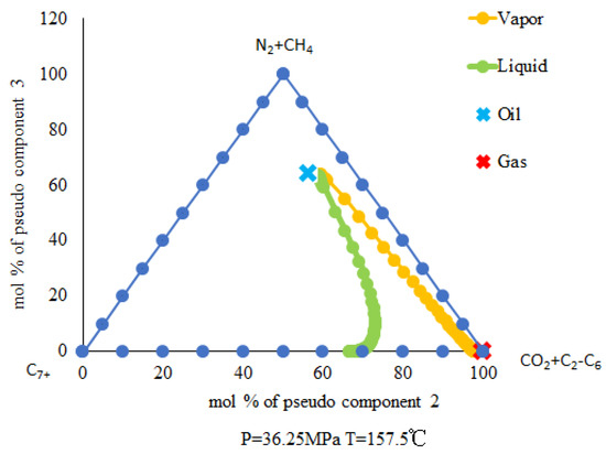 ① Two-flash experiment: the experimental sample was put into the PVT cell and adjusted to the laboratory temperature and pressure; then, the gas–liquid separation was performed, the amount of bled oil volumes was recorded with an electronic balance and density meter, and the separated gas–liquid was chromatographed (HP-6890 gas chromatograph and Agilent-7890A oil chromatography) to determine the composition of the reservoir fluid system, and the experiment aimed to find the well stream component and gas–oil ratio.