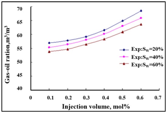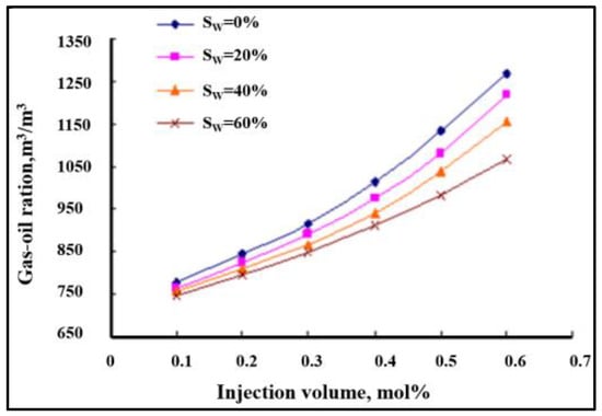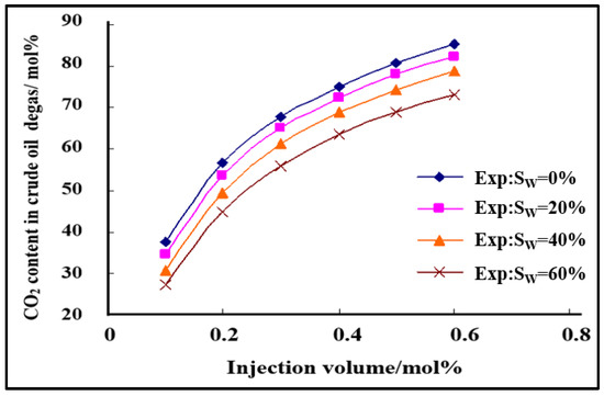 The experimental results of near-critical volatile oil injection CO2 phase characteristics are shown in Figure 14, Figure 15 and Figure 16. The experimental results show that the gas–oil ratio and gas–water ratio are positively correlated with CO2 injection and negatively correlated with water saturation. This is due to CO2 continuously dissolving in formation water, which reduces the content of dissolved CO2 in crude oil and the saturation pressure, resulting in lower gas content in crude oil degas, and the higher the water saturation, the less CO2 gas is contained in the degas.