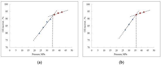 The experimental results are shown in Table 8 and Figure 17. In this CO2–water co-injection process, the CO2 to water injection ratio is 3:1. Experimental results show that the degree of crude oil recovery rate is positively correlated with the injection pressure, but the increase in recovery rate becomes decreasing as the pressure continues to increase. According to the petroleum industry standard “SY/T 6573-2016 minimum miscible-phase pressure experimental determination method—slim-tube method”, making the relationship curve between the degree of recovery and pressure, two straight lines between the data points and pressure for the degree of recovery greater than 90% and the degree of recovery less than 90% respectively, the reverse extension of the two lines, and the intersection of the two lines is the minimum miscible-phase pressure. Therefore, the minimum miscible pressure obtained from the slim-tube experiment with pure CO2 injection is 34.0 MPa, and the minimum miscible pressure obtained from the slim-tube experiment with CO2–water co-injection is 35.6 MPa. This indicates that when the injection pressure reaches 36 MPa, the crude oil recovery rate is greater than 90% for both pure CO2 injection and CO2–water co-injection, and the system is in a miscible-phase state. When the injection pressure is less than 36 MPa, the crude oil recovery is less than 90%, and at this time the gas–liquid has not yet formed a miscible phase. The results also show that the minimum miscible pressure obtained from the slim-tube experiment with pure CO2 injection is lower than the minimum miscible pressure obtained from the slim-tube experiment with CO2–water co-injection, which is due to the fact that when CO2–water is injected together, part of the CO2 is dissolved in water, resulting in less CO2 in contact with the crude oil and a higher miscible pressure.