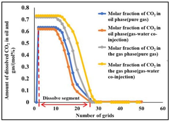 Using the slim-tube simulation method established in Section 2.2, a slim-tube simulation study with pure CO2 injection and CO2–water co-injection was conducted. The simulated values of the minimum miscible pressure for pure CO2 injection and CO2–water co-injection are shown in Table 9 and Table 10. The simulated CO2–water co-injection process is 3:1 ratio of CO2–water injection. As can be seen from Table 9 and Table 10, the simulated values of the minimum miscible phase pressure for pure CO2 injection and CO2–water co-injection are 34.8 MPa and 35.4 MPa, respectively, and the simulated and calculated values are very close to each other, with relative errors less than 1%. Therefore, the model of this slim-tube can better characterize the experiment procedure of the minimum miscible pressure for injection of pure CO2 and CO2–water co-injection in dense low-permeability near-critical volatile reservoirs. On the basis of the above experiments and simulations, a further simulation study of CO2–water co-injection into the slim-tube at the injection ratio of CO2 to water of 1:1 was carried out, and the simulation results are shown in Table 9, with a minimum miscible pressure of 35.7 MPa. It suggests that the larger the proportion of water in the CO2–water co-injection process, the higher the minimum miscible pressure of CO2 and crude oil.