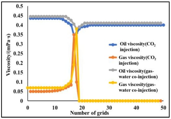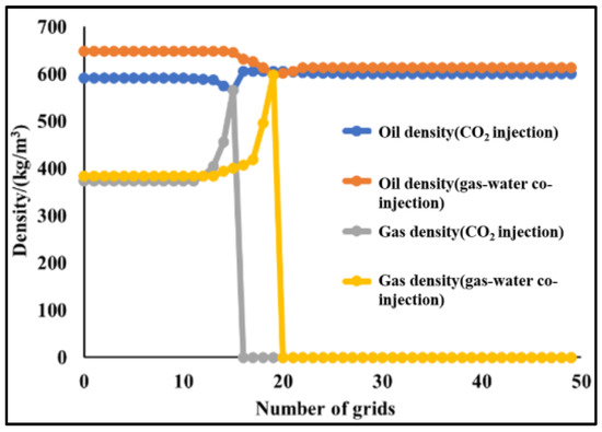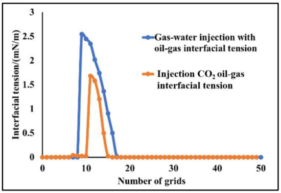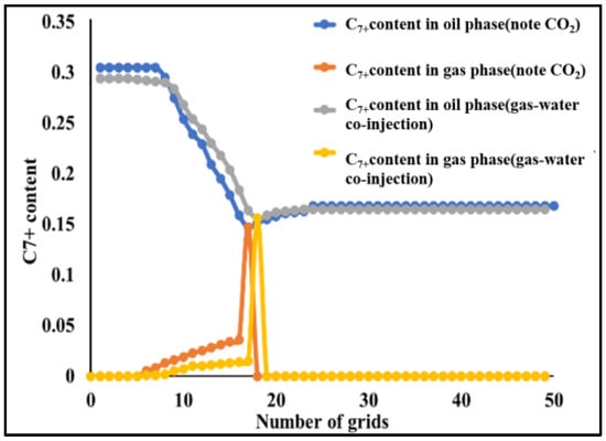 Based on the analysis of the degree of recovery, this paper also focuses on the change in CO2 and crude oil physical properties during the simulation of the slim-tube experiment with pure CO2 injection and CO2–water co-injection. The simulation results of CO2 content, C7+ content, density, viscosity, and surface tension in the gas–liquid phase obtained from the slim-tube simulation studies of pure CO2 injection and CO2–water co-injection (CO2 to water injection ratio of 3:1) are shown in Figure 18, Figure 19, Figure 20, Figure 21 and Figure 22. As can be seen in Figure 18, Figure 19, Figure 20, Figure 21 and Figure 22, at the same injection volume (0.3 PV) and pressure of 36 MPa, the CO2 will continuously extract the heavy hydrocarbon components from the crude oil in the sweep range of the injected fluids (pure CO2 injection and CO2–water injection) during the two displacement methods, causing the C7+ content to first decrease and then increase, and when the intersection of oil and gas phases exists, it indicates that the system reaches the miscible-phase state and the oil–gas interface When the intersection of oil and gas phases exists, the system reaches the miscible-phase state and the oil–gas interfacial tension decreases to zero. In the CO2–water co-injection process, the dissolved section of CO2 in oil and gas is relatively short, and the oil–gas density, viscosity, and interfacial tension are higher than those of pure CO2 injection, and the formation of the intersection point between gas and oil phases is later, indicating that part of CO2 is dissolved in water during CO2–water co-injection, resulting in less CO2 in contact with crude oil, leading to higher oil density, viscosity, and interfacial tension than those of pure CO2 injection. However, the CO2–water co-injection increases the sweep area, and the gas breakthrough is later, leading to higher oil displacement efficiency and more obvious development effect.