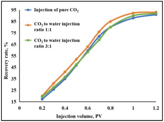 - The results of the slim-tube experiment show that when the injection pressure is greater than 36 MPa, both pure CO2 injection and CO2–water co-injection reach a miscible-phase state; the recovery rate of crude oil increases with the increase in injection pressure, and after reaching a certain pressure point, the increase of in recovery rate will slow down; the minimum miscible pressure under CO2–water co-injection is higher than that under pure CO2 injection. This is due to the fact that when CO2–water is co-injected, part of the CO2 is dissolved in water, resulting in less CO2 in contact with the crude oil and a higher miscible pressure.
