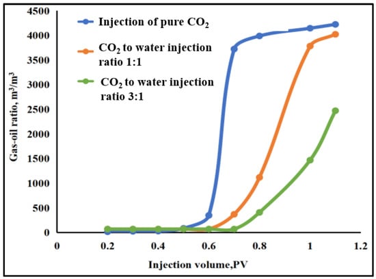 In order to explore the effect of different gas–liquid injection ratios on crude oil recovery during CO2–water co-injection, a slim-tube simulation study of CO2–water co-injection with different gas–liquid injection ratios (CO2 to water ratio of 3:1 and CO2 to water ratio of 1:1) was conducted at formation temperature (157.5 °C) and 36 MPa (miscible-phase pressure), and the simulation results were compared with pure CO2 injection. The variation of crude oil recovery and gas–oil ratio with pure CO2 injection and different gas–liquid injection ratios (CO2 to water ratio of 3:1 and CO2 to water ratio of 1:1) are shown in Figure 23 and Figure 24. The simulation results show that the crude oil recovery degree of CO2–water co-injection is higher than that of pure CO2 injection. Under the three replacement conditions, the highest degree of crude oil recovery is achieved by CO2–water co-injection with CO2 to water ratio of 1:1, and the lowest by pure CO2 injection. The higher the ratio of water in CO2–water co-injection, the later the gas–oil ratio rises, and the later the CO2 breaks through, the higher the degree of crude oil recovery. This suggests that gas–water co-injection increases the influence of the sweep area and effectively inhibits the occurrence of gas scramble, thus improving the degree of crude oil recovery.