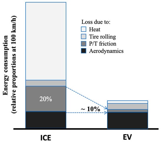 Nowadays, attention has been focused on reducing energy loss and improving efficiency, since any relatively small proportion of them is becoming crucial in any technology. Improvement of electric consumption, heralded as the critical step in the reduction of transportation’s impact on climate change, can be used as an example in the adapted Figure 1 from the work of Kawamata et al. []. Loss due to friction in the motor-based drive system of an electric vehicle (EV) system is still responsible for approximately 10% of the total global energy consumption. Loss due to aerodynamics is the most important factor of an EV during operation compared with an internal combustion engine (ICE), but there is still room for improving the current levels of energy consumption by paying attention to these slight proportions as loss due to friction.