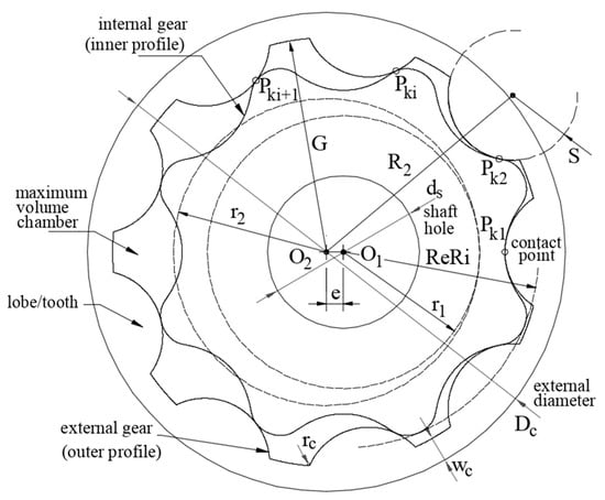 - Robison, A.; Vacca, A. Performance comparison of epitrochoidal, hypotrochoidal, and cycloidal gerotor gear profiles. Mech. Mach. Theory 2021, 158, 104228. [Google Scholar] [CrossRef]