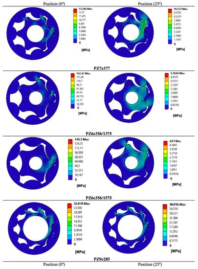 - Maximum volume chamber position corresponding to PZ7e377(25°), PZ6e356/1375(0°), PZ6e356/1575(0°), and PZ9e285(0°). The location of the contact point at maximum stress is Pk2 for all gear sets, according to researchers’ and authors’ results. (Note: PZ7e377(25°) gear set in reference [] does not provide an exact value but it can be gathered from the graphical figures);