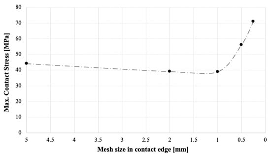 For the PZ9e285(25°) case, the mesh convergence analysis was performed obtaining the results plotted in Figure 4. The figure shows a clear contact stress value trend when reducing the contact edge sizing from 5 mm (11.5% variation) to 2 mm and from 2 mm (0.4% variation) to 1 mm. However, for smaller mesh sizes (0.50 mm and 0.25 mm), local stress concentration effects were observed to increase the maximum contact stress in a fictitious way. Thus, 2 mm edge size was precise enough to carry out the research, but 1 mm was chosen because it was more precise and was not a significantly greater calculation effort than the 2 mm case. For a 1 mm mesh size case, the PZ9e285 model included 7164 nodes, 2218 2D elements, and 420 contact elements.