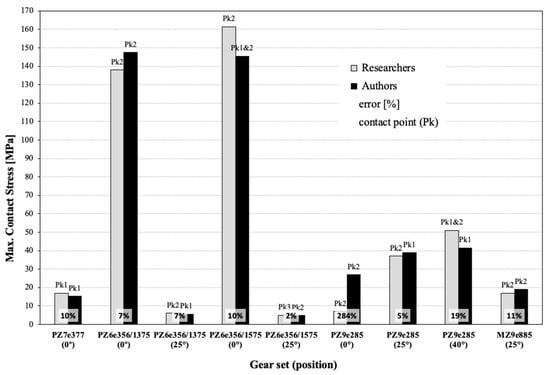 Results comparison Researchers vs. Authors, relative error [%] in maximum contact stress [MPa] and contact point (Pk) of maximum contact stress in each gear set for corresponding angular position in brackets (degree °).