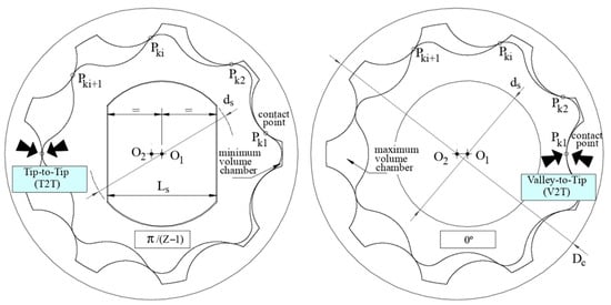 - Two specific angular positions as working functions will be under the study: Tip-to-Tip (T2T) and Valley-to-Tip (V2T), both depicted in Figure 6. The V2T corresponds to the maximum volume chamber and the T2T corresponds to the minimum volume chamber. This labeling presumes to enhance the comprehension of the contact points’ action;