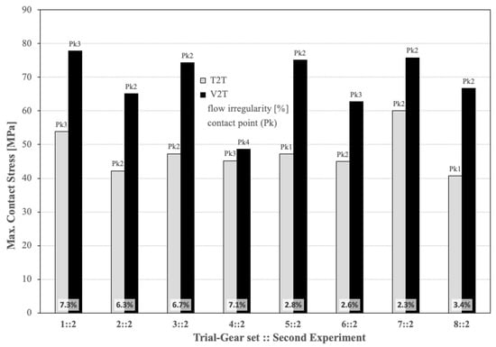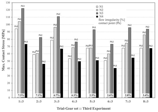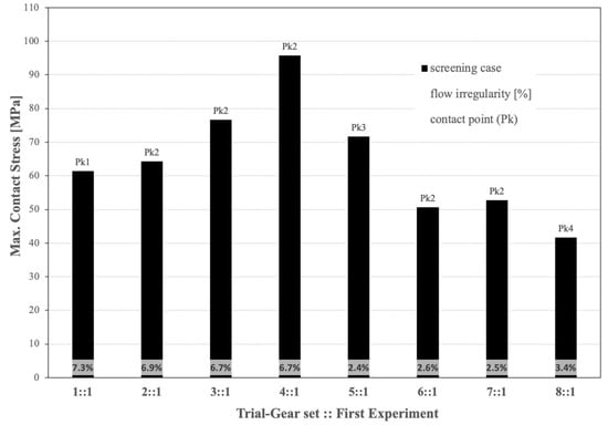 Results of FEM maximum contact stress [MPa], GeroLAB flow irregularity [%], and contact point (Pk) of maximum contact stress in each gear set for the first Taguchi experiment (see Table 4).