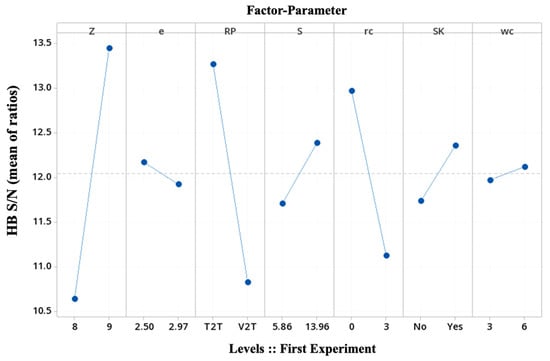 Figure 8 illustrates the main effects plot for the screening case. The true critical characteristics (control factors) must be identified and minimized in number. This graphic aids in a better picture of the importance of the chosen control parameters. The larger the vertical increment between the two levels and the higher the slope in each factor, the more emphasis is placed on this parameter: the larger the HB S/N ratio, the better. The figure indicates that the parameters Z, RP, and rc are the strength factors. Conversely, the parameter wc, with a behavior almost horizontal between the two levels, is the first factor to be discarded, together with the parameter SK.