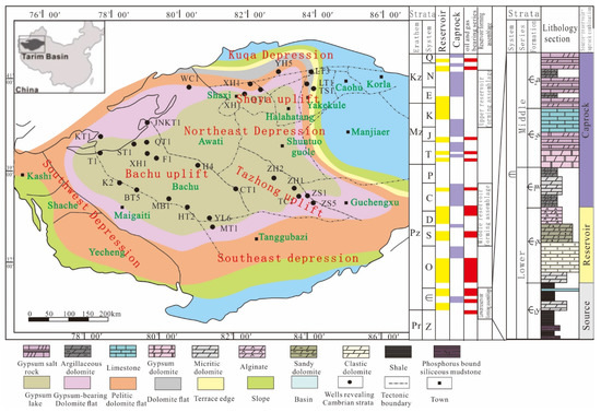 The Paleozoic (which includes the Cambrian, Ordovician, Silurian, Devonian, and Carboniferous), Mesozoic (which includes the Permian, Triassic, and Cretaceous), and Cenozoic (which includes the Paleozoic, Neoproterozoic, and Quaternary) systems developed in the order from the bottom up in the study area [22]. The Middle Cambrian gypsum-salt caprock is developed, and when combined with the hydrocarbon source rocks of the Yuertusi (Є1y) Formation and the Xiaoerbulake (Є1x) dolomite reservoir in the Lower Cambrian, it forms a high-quality lower-formation reservoir assemblage (Figure 1) [23], with oil resources of 34.5 × 108 t and gas resources of 5.98 × 108 t, accounting for 46% and 51%, respectively [24].