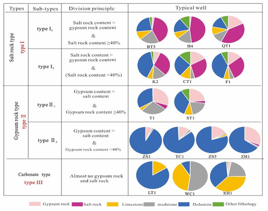 Rock assemblage types: According to the content of different lithologies, the gypsum-salt caprocks can be divided into the salt rock type (type I), gypsum rock type (type II), and carbonate type (type III). Furthermore, the first two types can be further divided into two sub-types using 40 percent content as the boundary (Figure 3).