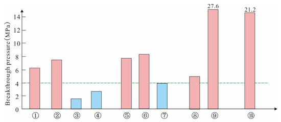 Comparison of the average breakthrough pressure of different lithological caprock layers. ① = micritic dolomite, ② = gypsum dolomite, ③ = fine crystalline dolomite, ④ = granular dolomite, ⑤ = micritic limestone, ⑥ = gypsum limestone, ⑦ = granular limestone, ⑧ = gypsum rock, ⑨ = salt rock, ⑩ = mudstone. Using 4 MPa as the boundary, those greater than 4 MPa are the dominant lithology, which are marked with red columns. (Data source: Wu et al., 2022 [9]).