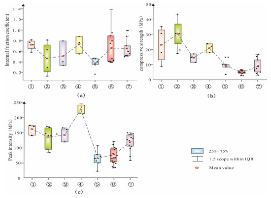 Comparison diagram of lithology and mechanical properties: (a) coefficient of internal friction, (b) compressive strength, (c) peak intensity. ① = gypsum dolomite, ② = micritic dolomite, ③ = micritic limestone, ④ = gypsum limestone, ⑤ = salt rock, ⑥ = gypsum rock, ⑦ = mudstone.