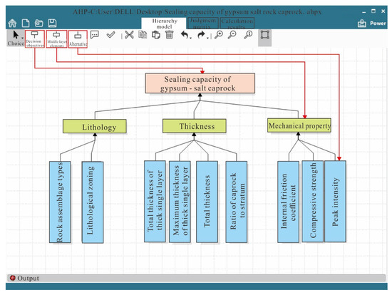 Among them, rock assemblage type and lithological zoning belong to “lithology”; total thickness of the thick single layer, maximum thickness of the thick single layer, total thickness, ratio of caprock to stratum, and total belong to “thickness”. The coefficient of internal friction, tensile strength, and peak strength are “mechanical qualities” that are finally assigned to the decision target—the sealing capacity of gypsum-salt caprock (Figure 7).