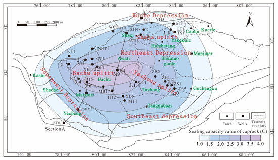Contour map of sealing capacity value of Cambrian gypsum-salt caprock in the Tarim Basin. The trend of the isoline of caprock sealing capacity refers to the sedimentary facies map. Taking the west by south of the basin as the center, the sealing capacity gradually deteriorates to the surroundings.