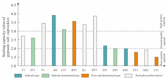The parameters of the Cambrian gypsum-salt caprock were allocated according to Table 1 and computed using Equation (2) to complete the closure capacity evaluation according to the evaluation system (Table 7). The C-value in the Bachu area ranged from 2.6 to 3.9, with an average value of 3.3, indicating high quality caprock; the C-value in the Taichung area ranged from 1.8 to 22, with an average value of 2.0, indicating general quality caprock; and the C-values of the two wells in the Tabei uplift, LT 1 and XH 1, were less than 2, indicating poor quality caprock (Figure 8).