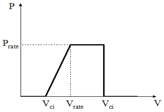 The principle of a wind turbine is to convert mechanical energy into electrical energy. The output power of a wind turbine is highly dependent on the wind speed, and the function and curve (shown in Figure 1) describing wind generation are given as follows: