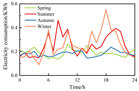 The real load data of three hundred households has been given in [48], and four typical (postcode:2010) days in different seasons were selected to represent the daily load change. The corresponding curves are depicted in Figure 5, which show that the load demand presented seasonal variation characteristics; namely, the power demand in summer and winter was larger, compared with that in other seasons. In order to obtain a more accurate prediction result for the load data, the average seasonal power demand per day was used to simulate the load distribution on Garver’s network. The obtained data were taken as the input to a normal PDF for the scenario generation.