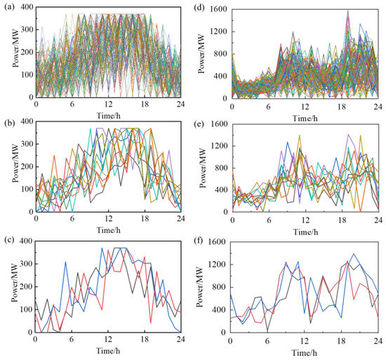 Scenario reduction process, regarding wind power and load scenarios: (a) 100 scenarios of wind power; (b) 10 scenarios of wind power; (c) 3 scenarios of wind power; (d) 100 scenarios of load; (e) 10 scenarios of load; and (f) 3 scenarios of load.