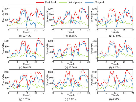 Net load under the different scenarios: (a) 22.46%; (b) 16.18%; (c) 13.89%; (d) 10.61%; (e) 10.00%; (f) 9.26%; (g) 6.67%; (h) 6.56%; and (i) 4.37%.