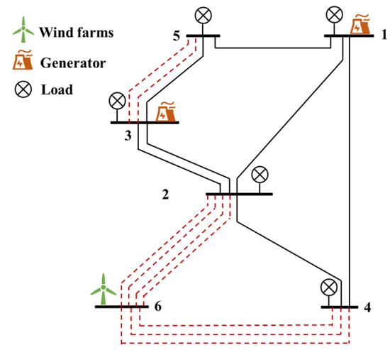 where is the total investment cost of adding transmission lines, is the cost of adding one transmission line between bus i and bus j, and denotes the number of new transmission lines which should be built between bus i and bus j. The specific data are provided in Table 1.
