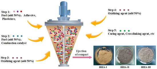 A variety of components such as oxidant CH6N4O3, fuel (Mg, B, Al, Si, or C), combustion regulator Cu2Cr2O5, binder (HTPB), and plasticizer (C26H50O4) were prepared. The quality of the components is shown in Table 1. Different components, named HEEA-I, HEEA-II, and HEEA-III, were prepared. Among them, the fuels were all ultra-fine nano-scale powders, HEEA-I was mainly carbon powder, HEEA-II was silicon powder, and HEEA-III was aluminum powder. HEEA consists of multiple components. The oxidizing agent is potassium nitrate or potassium perchlorate, and the fuel is composed of one or two of guanidine nitrate, C-powder, Al-powder, Si-powder, Mg-powder, etc. The burning rate regulator is Cu2Cr2O5, the adhesive is HTPB, and the plasticizer is C26H50O4. The percentage of component mass is shown in Table 1.