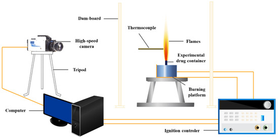 The energy parameters such as combustion heat, gas specific volume, and explosion pressure of HEEA were strictly implemented according to the GJB 770B-2005 test method. The combustion flame of the sample was captured by a CCD camera, the temperature of the flame area was measured by a thermocouple, and the temperature distribution of the combustion flame was obtained using the wavelength integration two-color method [26]. The test system is shown in Figure 2. To reduce the influence of the outside air flow on the combustion flame, an air baffle was installed around the combustion platform. First, the sample to be tested was loaded into a paper charge column with a size of φ10 × 50 mm, and the charge density was 1.0 g/cm3.