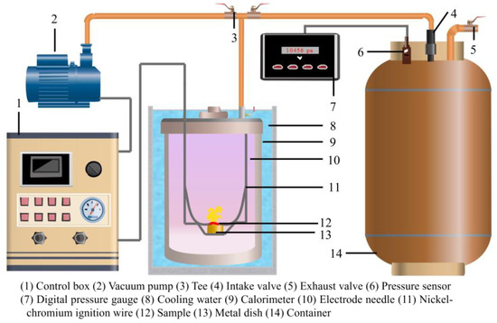 The gas specific volume measuring device is shown in Figure 4; it is mainly composed of an oxygen bomb (300 mL), a gas-collecting container tank (4 L), a digital manometer, and a vacuum pump. Firstly, 5.0 g of the sample to be tested was put into the crucible and placed in the oxygen bomb. The oxygen bomb and the gas collecting vessel were vacuumized by the vacuum pump, and the pressure value was less than 4 × 10−4 MPa. The ignition switch was started, the sample was ignited, the oxygen bomb was put in cold water to cool to room temperature, the gas was introduced into the collection container tank, and data were recorded after the numerical value of the digital manometer was stable. Ordinary filter paper was used to wipe all the water droplets in the oxygen bomb, and the oxygen bomb was placed in the weighing box for weighing. After being fully dried, it will be weighed again, and the specific volume of gas generated by the combustion of the sample will be calculated by the formula provided in the standard. Each group was tested twice, and if the difference between the two results was less than 6 L/kg, the average value was taken. If the two results were more than 6 L/kg, then another determination was made and the average of the two results was taken. If the results of the supplementary test were between the original two results, and neither of them exceeded the difference, the average of the three results was taken.