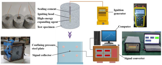 The HEEA rock-breaking effect test was carried out with self-made concrete specimens, as shown in Figure 6. The rock-breaking test device is mainly composed of a test piece, a confining steel plate, an igniter, and an acoustic emission operating system. The compressive strength of the specimen was 40 MPa and the size of the concrete specimen was φ100 mm × 100 mm. The mechanical parameters are shown in Table 2. A charging hole of φ10 mm × 60 mm was drilled at one end of the specimen, and 0.2 g of the sample was weighed and placed in the charging hole and sealed. Then, the acoustic emission signal acquisition device was attached to the outside of the specimen. The specimen was ignited by an ignition generator, and the computer system collected acoustic emission data to observe the crack fracture state of the specimen.