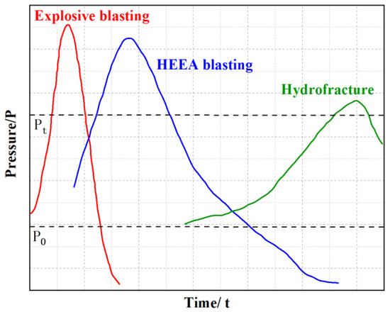 As shown in Figure 12, compared with explosive blasting and HEEA blasting, HEEA action time is much longer. The action time of an explosive is microseconds, and the action time of HEEA is milliseconds, so it will form cracks with a large range and high complexity in the process of rock breaking. On the contrary, the action time of hydraulic fracturing is too long, the loading rate is low, the number of fractures formed is limited, and the fracture network cannot be effectively formed. However, the peak pressure of high-energy gas is high, and the pressure reduction rate is slow. Therefore, high-energy gas rock breaking has a broad prospect in the field of engineering blasting.